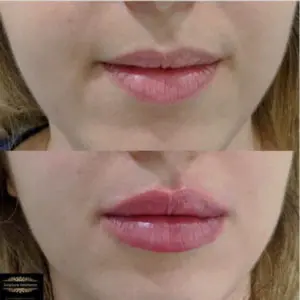 Lip filler treatment to plump up the natural lips as well as correct upper lip asymmetry.